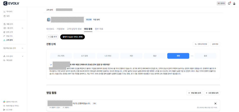 “셀데이” 고객 관리 화면 – 고객별 영업 진행 사항 통합 분석 및 관리 기능 제공 * 기업 정보의 경우 모자이크 처리했습니다.