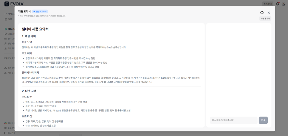“셀데이” 실제 제품 분석 화면 – 문서 기반 제품 요약 및 전략 수립 지원