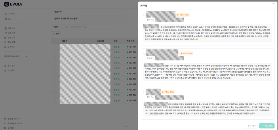 “셀데이” AI 추천 화면 – 잠재 고객 정보 기반 우선도 분석 * 기업 정보의 경우 모자이크 처리했습니다.