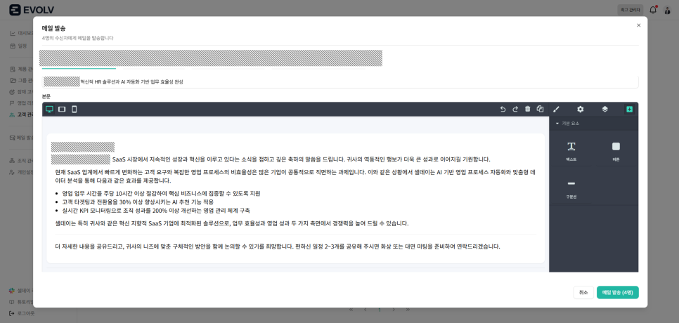 “셀데이” AI 메시지 생성 화면 – 제품, 고객, 영업 이력 기반 자동화된 메시지 초안 생성 * 기업 정보의 경우 모자이크 처리했습니다.